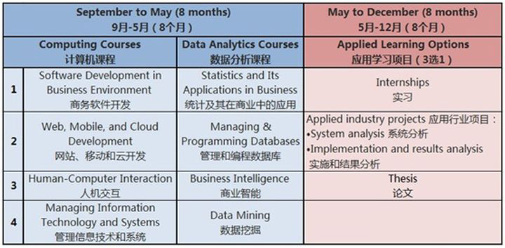MScCDA计算机和数据分析师,课程建立在数学和计算机作为工具的基础上,包括两个最基本的方面计算机和数据分析:硬件和软件平台的开发,个性化定制和管理;商业智能:采购,储存,管理和对大量数据的分析来提高效率和客户体验。该项目伴随着尖端技术的出现成为设计师,商业解决方案的程序员,IT经理,分析师和企业家有效的工具。所学课程包含:商业环境中的软件开发,商业统计学及应用,人机互动,管理和设计规划数据库,网络,手机和云端的应用开发,商业智能,通信技术和系统管理,数据挖掘。许多毕业生在毕业之后进入Blackberry(黑莓公司)等全球著名的科技创新企业。