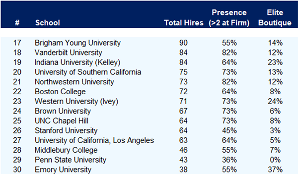Semi-Target School:这些投行中有不少校友的学校,但不一定在每家公司都有不错的表现。许多准目标学校只是在特定地区、行业或银行中占据主导地位,并不具备全国性优势。