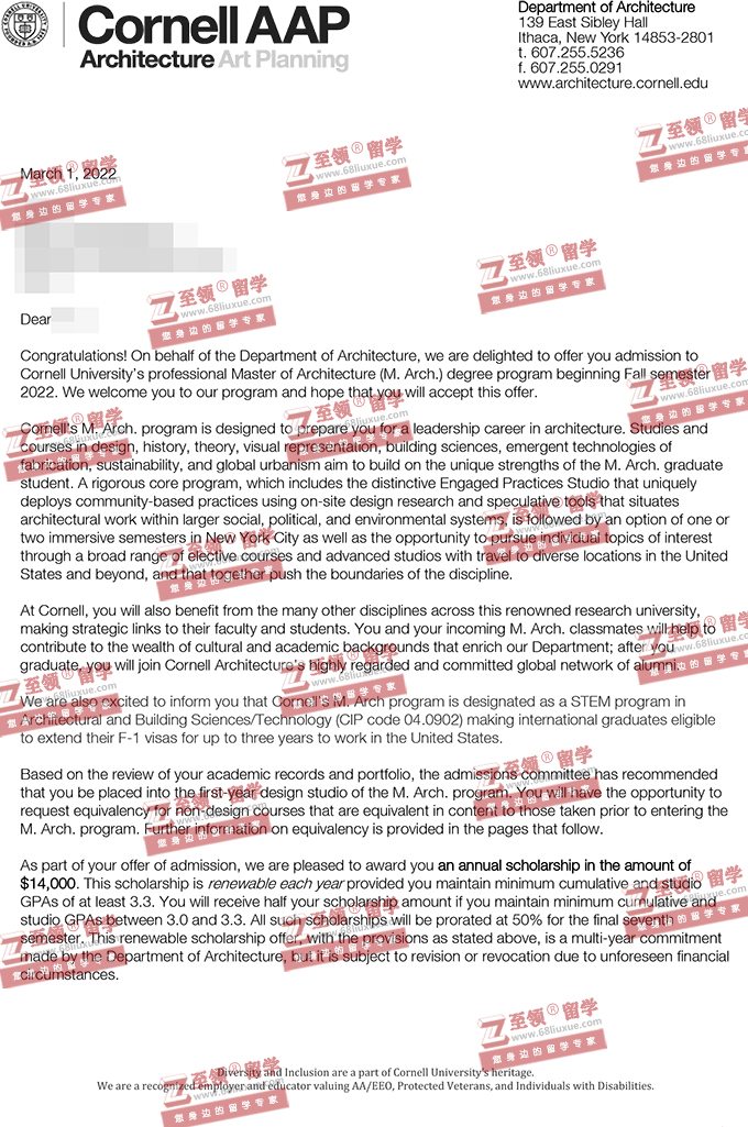 录取结果:Cornell University,Master of Architecture (Professional) 康奈尔大学建筑学硕士录取,奖学金:14000美元/年+GTRS 10164美元/每个学期(一共给两个学期)