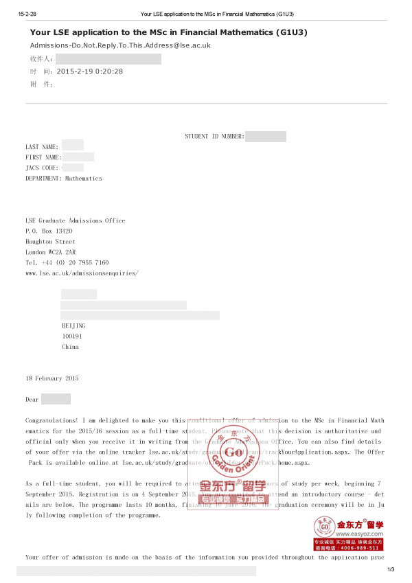 录取结果:伦敦政治经济学院,MSc Financial Mathematics金融数学