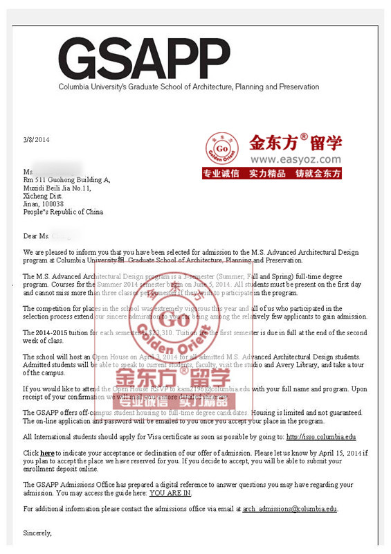 最终,功夫不负有心人,F同学顺利拿到了包括美国建筑学常青藤名校哥大建筑学GSAPP MAAD、宾大建筑学M.Arch II, 康奈尔建筑学M.Arch II, 及南加大、UCLA、UVA六所顶级名校的录取,下面是哥大的录取展示。