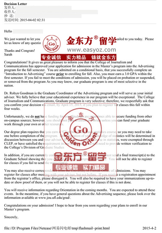 在金东方留学团队的帮助下,在所有资料都准备好以后就递交了申请,美国就拿到了波士顿大学广告专业录取,这个录取更是相当牛的。现在又收到了弗罗里达大学广告专业录取offer,学生如愿以偿的拿到了理想大学的offer,所有人都比较欣慰。