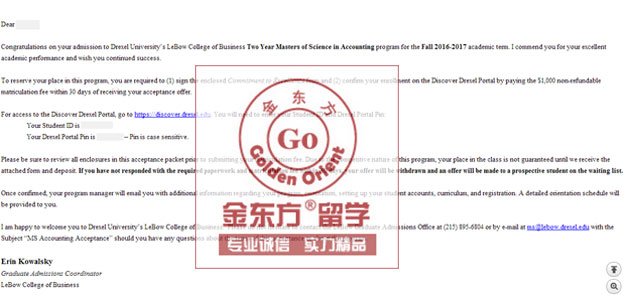 令人欣喜的是,等待的煎熬并没有持续多久,我们就收到了Drexel University的录取通知,并且在第一学年给了9300多美金的奖学金,如果能保持3.0的GPA,第二学年Y同学还将顺理成章地拿到9700多美金的奖学金。 在此,希望Y同学的成功案例能给那些在硬件条件上并不突出的怀揣留学梦的同学以鼓舞,只要坚持梦想,做出正确的选择,一定能够得到好的结果!
