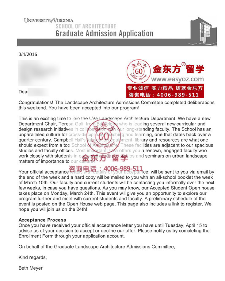 果不其然,在材料寄出后没多久,C同学就收到了弗吉尼亚大学景观设计硕士的录取OFFER。