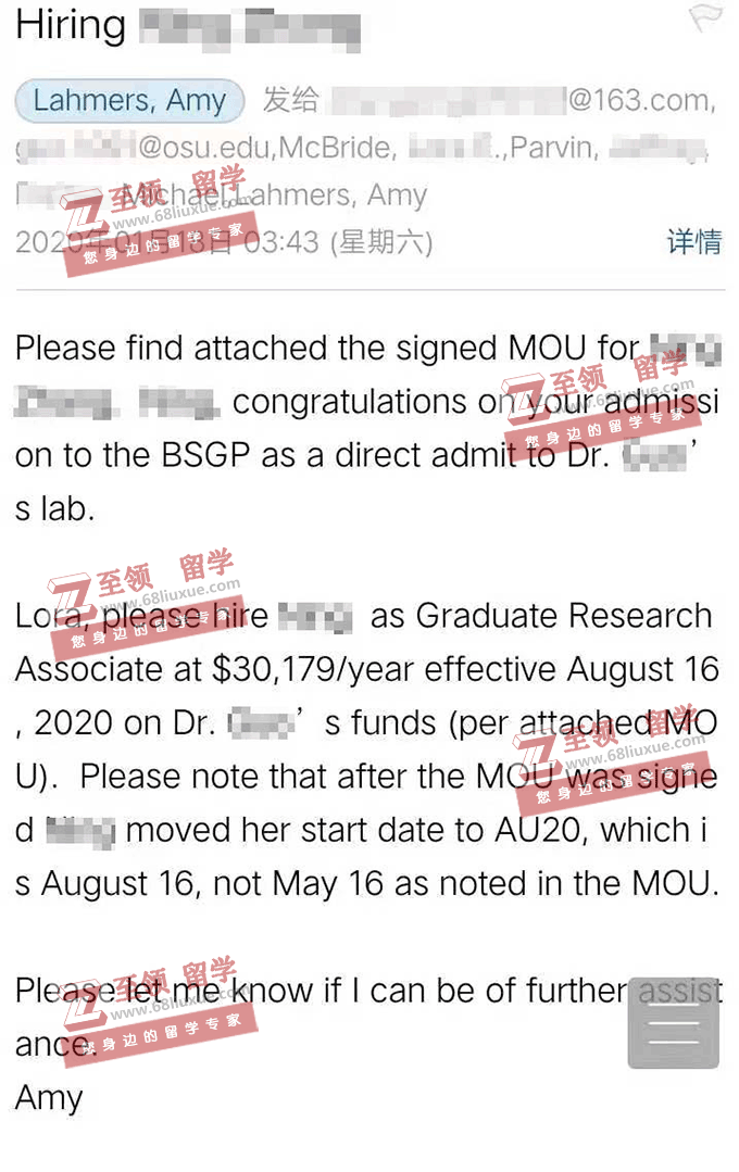 在推荐人方面,Z同学找了一位本校很牛的教授做推荐,这为申请做了很大贡献。文书方面重点突出Z同学的科研经历,出色的文书不负众望拿到了俄亥俄州立大学的面试机会,在详细的面试指导之后,Z同学顺利获得该校的全奖录取,并且每年给予学生补贴3万多美金。