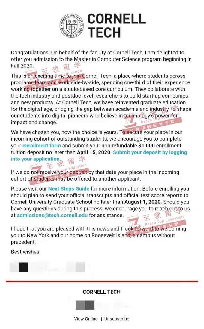 录取结果:Cornell U – Cornell Tech,M.Eng in Computer Science康奈尔大学计算机科学工程硕士录取