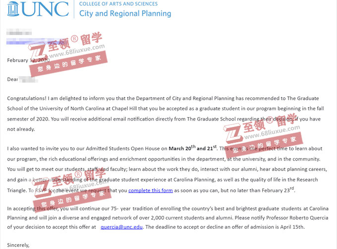 在申请前期,我们积极鼓励学生丰富软背景,学生参加了多次科研/实习,经过后期多次的文书磨合,H同学顺利拿到了北卡罗来纳大学教堂山分校MCRP项目的OFFER!