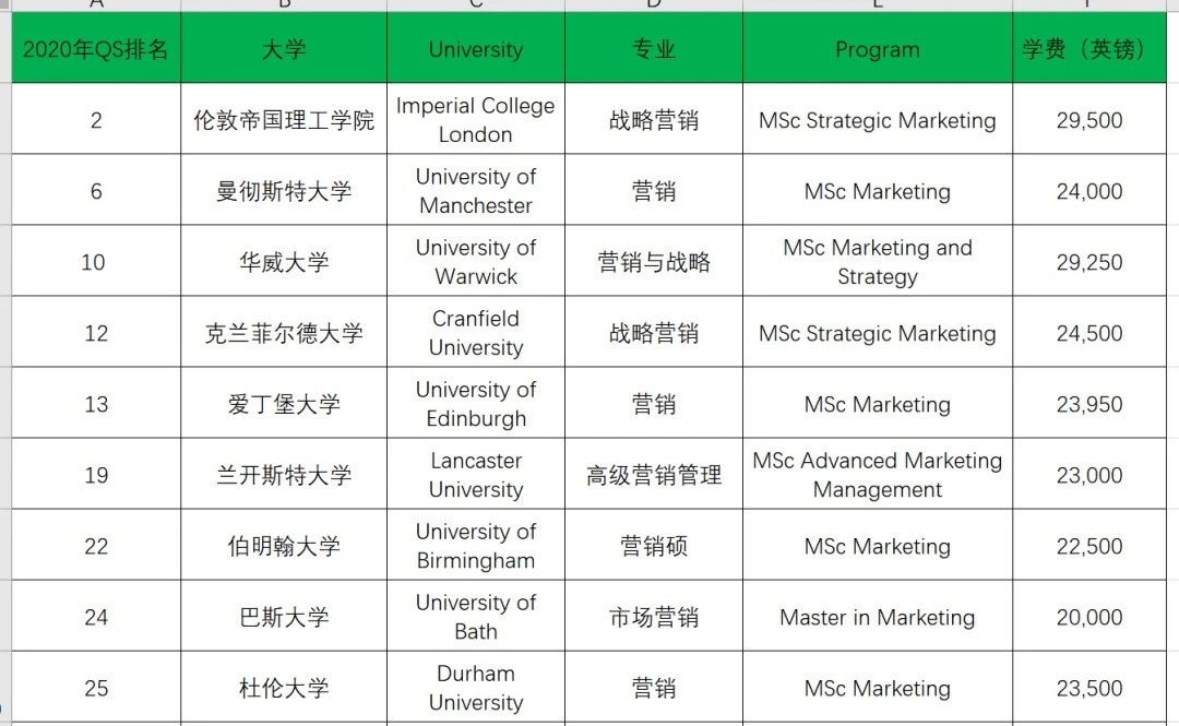 根据QS 2020年营销硕士排名,以下是英国提供此课程的前10名大学: